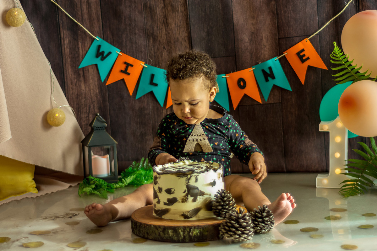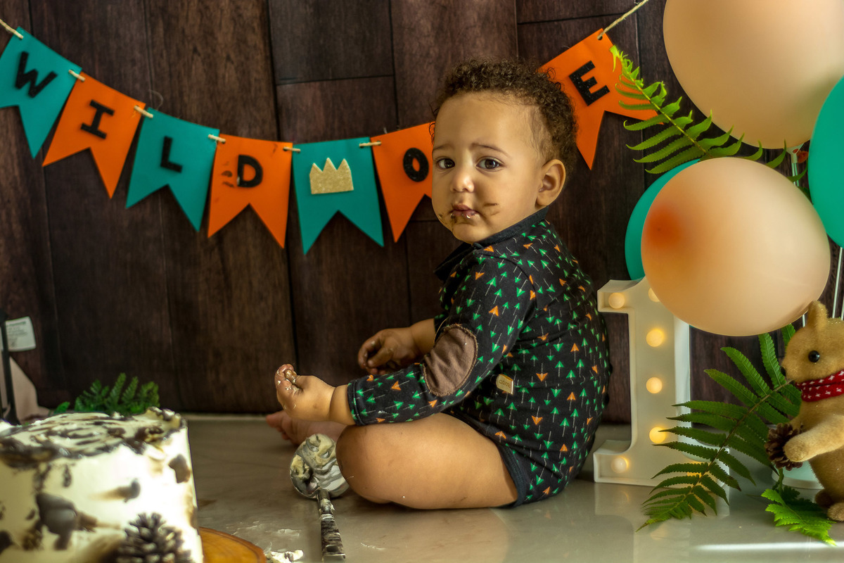 Eu amo planejar e elaborar cenários para sessão de smash the cake. Desde que o Estêvan nasceu eu já sonhava com essa sessão. Como eu não queria fazer festa, decidi que esse registro seria tão especial quanto todos os outros que já fiz. Estêvan significa "O Coroado" então comecei a pesquisar algo bem diferente para o tema. Não queria nem príncipe, nem rei, nada muito óbvio. E como eu sempre faço algo diferente para meus clientes, assim fiz para meu filho. O tema escolhido foi "Wild One" que significa "Selvagem" e também tem coroa. Eu simplesmente amei o resultado! Apesar do Estêvan não ter feito a bagunça que eu esperava que ele fosse fazer com o bolo, fiquei realizada com esse ensaio.