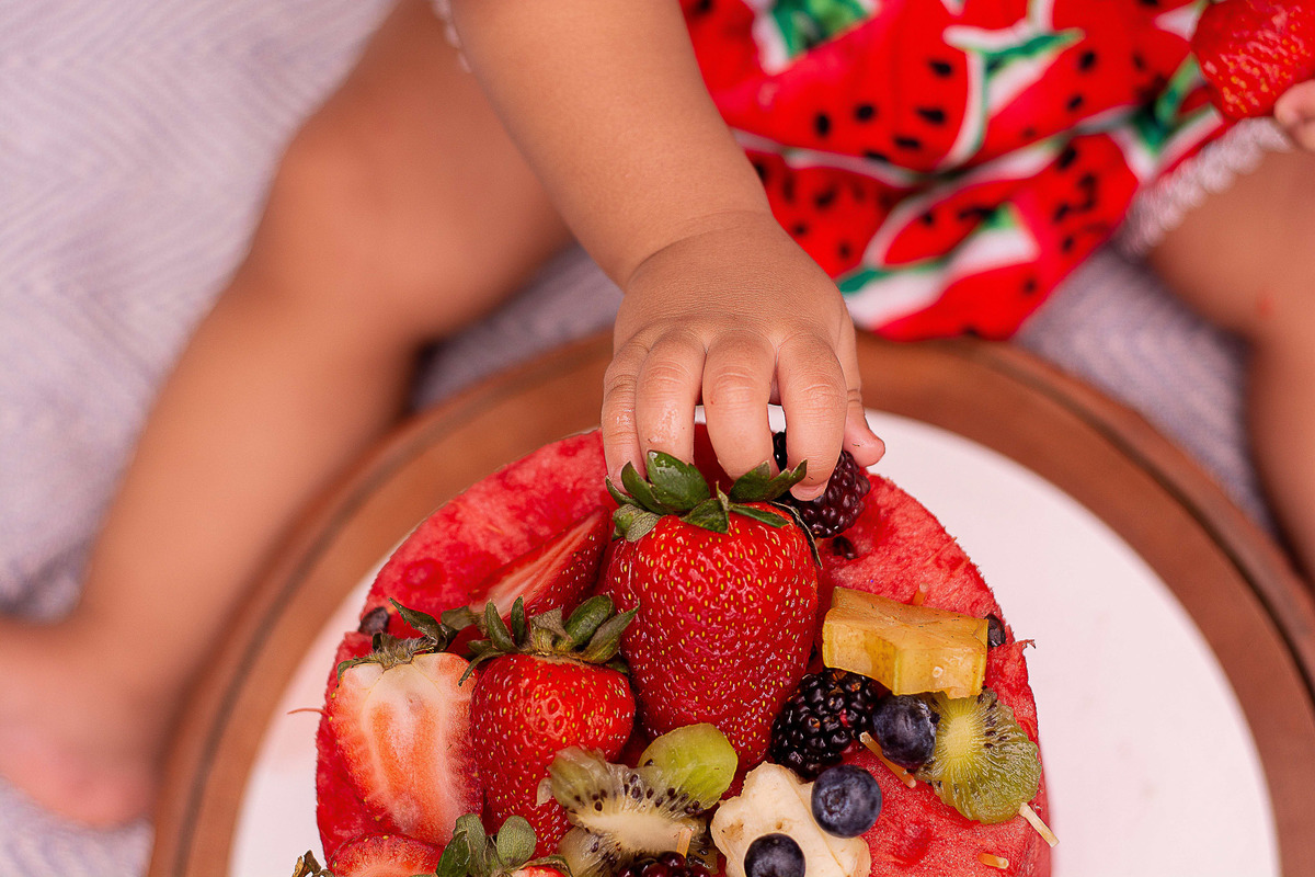 O papai também participou da Sessão e a Vivi curtiu muuuitoo comer todas essas frutinhas coloridas que colocamos para ela.